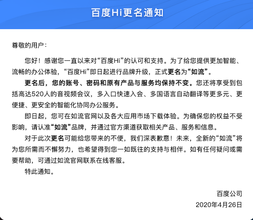 4月26日,百度旗下在線辦公平臺(tái)“百度Hi"宣布進(jìn)行品牌升級(jí),正式更名為“如流"。