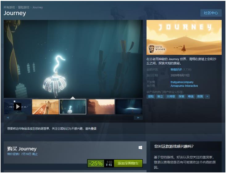 Steam 版本的《風之旅人》目前在 7 月 10 日之前可享受 25%的折扣,如果你在 6 月 25 日之前購買它,則也將免費獲得 FLOWER。目前總售價 55 元,優惠價 41 元,支持簡體中文。
