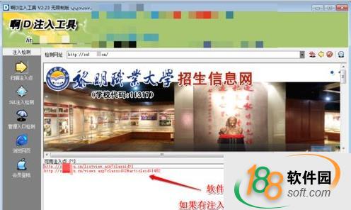 4、此時,等待一會兒,軟件下方會顯示檢測到當前頁面的注入點,如果首頁沒有,可以換其他頁面,可在網頁上點擊進入其他頁面,點擊進入網站各個欄目,看看各個頁面是否有注入點。如果點擊所有頁面和連接都沒有注入點,可能你網站不存在常用注入漏洞