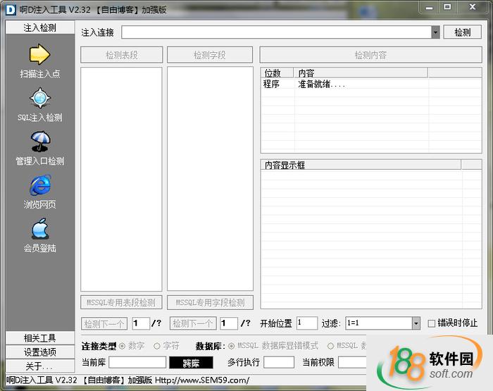4、內集"跨庫查詢"、"注入點掃描"、"管理入口檢測"、"目錄查看"、"CMD命令"、"木馬上傳"、"注冊表讀取"、"旁注/上傳"、"WebShell管理"于一身的綜合注入工具包