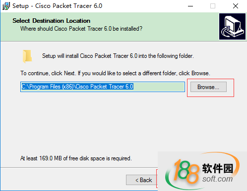 3、選擇Cisco packet tracer安裝位置。點擊【瀏覽】,選擇軟件的安裝路徑;或者直接點擊【下一步】,軟件會安裝在默認的位置。