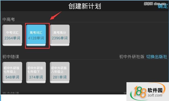 2、登陸成功后選擇你需要背的詞匯內容后點確定(主要包括初中及高中全部詞匯);