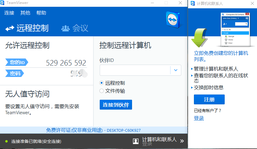 3、注意,向日葵軟件要注冊,TeamViewer軟件不用注冊就可以即時使用。