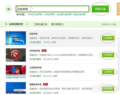 6、這里我們假設電腦沒有聲音,搜索出來以后可在當前頁面下下拉,找到與當下情況描述相符合的問題解決辦法,選擇修復。