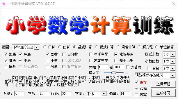 小學生計算天天練適用于學前班、小學生口算練習。系統提供屏幕練習、制作口算題卡打印練習(保護兒童視力)。