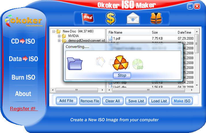 Okoker ISO Maker是一款專業ISO制作和燒錄軟件。能夠快速制作iso文件,燒錄到CD/DVD-R光盤,能夠提取光盤內容為ISO文件,支持ISO DVD, DVD+RW, DVD+R, D